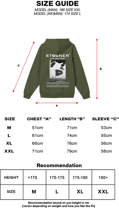 Skater Design Military - Green es una sudadera con estampado de skater por la parte de atrás y logo de Stooner Streetwear en la parte frontal. Diseñada en Madrid, esta sudadera de estilo streetwear tiene un corte oversized.
