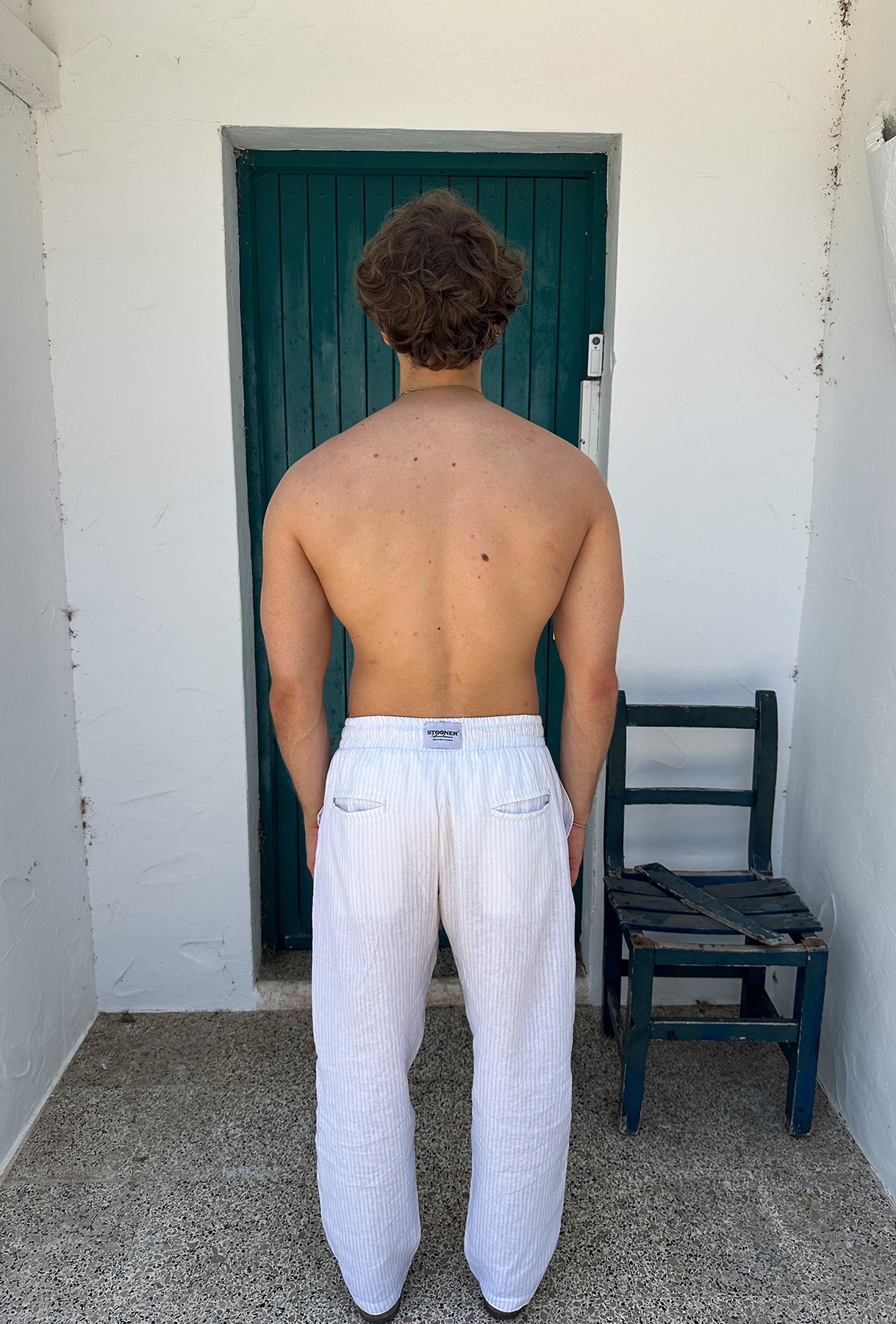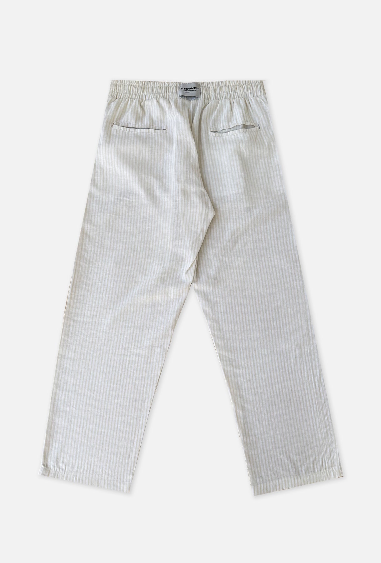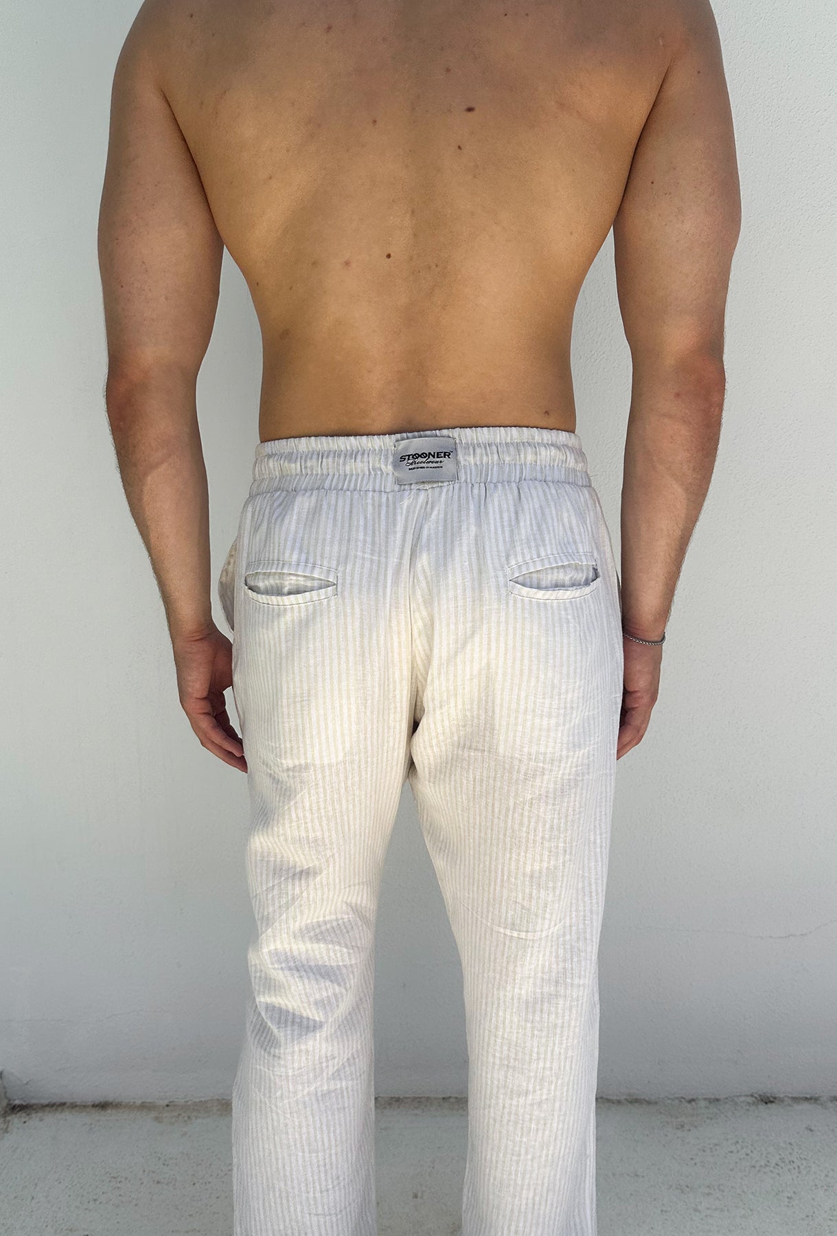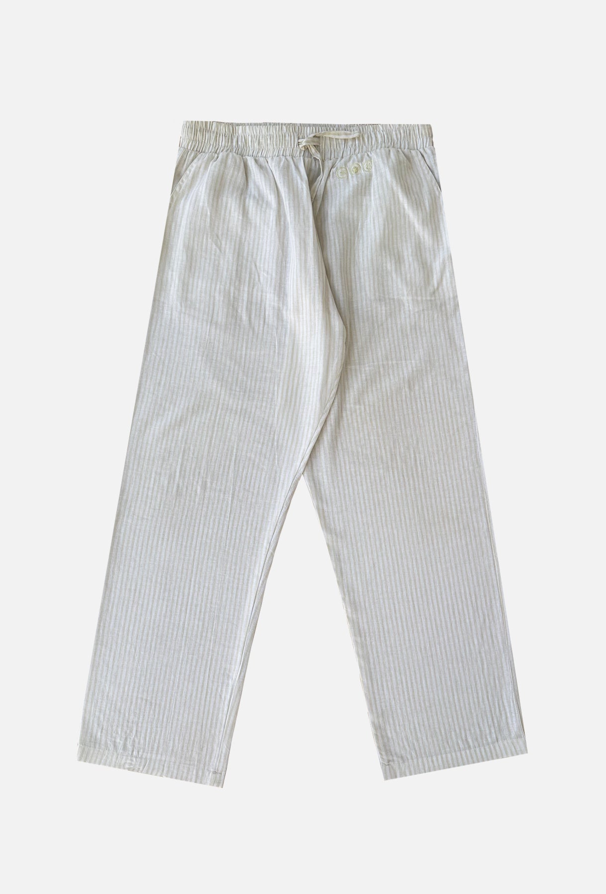 Pantalones MAHÓN LINEN PANTS, pantalones de lino con algodón. La prenda perfecta para verano, completamente transpirables gracias al lino, muy frescos, perfectos para ir a la playa o a un tardeo con amigos. Color blanco con sutiles rayas color arena